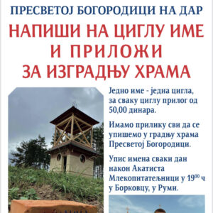 Српска православна Епархија сремска и Црквена општина Рума, позивају верни народ да помогне изградњу храма Пресветој Богородици, учешћем у акцији под називом „Једно име – једна цигла“. Акција је осмишљена тако да сваки приложник, добија циглу са својим именом у вредности прилога од 50,00 динара,