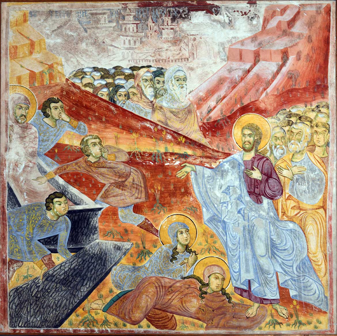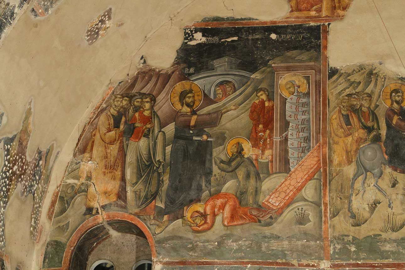 Кад Исус дође у Витанију, Лазар већ четири дана беше у гробу. Марта прва сазнаде о доласку Иусову и похита Му на сусрет, док међутим Марија у дубокој тузи сеђаше дома. Павши пред ноге Исусове, Марта рече: „Господе, да си Ти био овде не би мој брат умро. А и сад знам, да што заиштеш у Бога, даће Ти Бог.“ Исус потврди њену наду: „Брат ће твој устати.“ „Знам да ће устати о васкрсењу, у последњи дан“, одговори Марта. „Ја сам васкрсење и живот: који верује у Мене и ако умре живеће. И ни један који живи и верује у Мене неће умрети ва век. Верујеш ли ово?“, рече јој Господ Христос. „Да, Господе, ја веровах да си Ти Христос, Син Божји, који је требало да дође на свет“, одговори она и похита кући, где полако рече сестри: „Учитељ је дошао и зове те.“ Чувши радостан глас, Марија устаде брзо и отиде к Исусу. А Исус још не беше дошао у село, него беше на оном месту где Га срете Марта. У то време у дому Лазареву беше много Јудејаца, који дођоше да утеше сестре у тузи. Видевши како Марија брзо изиђе из куће, они помислише да оде на гроб Лазаров да плаче, и пођоше за њом. Али их Марија претече, они је видеше на коленима код ногу Исусових. Марија говораше: „Господе, да си Ти био овде, не би умро мој брат.“ Плач угуши њен глас. Сви присутни не могоше уздржати сузе; сам Исус згрози се у духу и постаде жалостан. „Где сте га метнули?“, запита Исус. „Господе , хајде да видиш“, одговорише Му. Ударише сузе Исусу. „Гледај како га љубљаше“, рекоше Јудејци, а неки од њих рекоше: „Не могаше ли онај који отвори очи слепцу учинити да и овај не умре?“ Приђоше пећини у којој беше тело Лазарево. „Узмите камен“, рече Господ Исус. Али Марта рече: „Господе, већ смрди; јер су четири дана како је у гробу.“ Исус јој одговори: „Не рекох ли ти да, ако верујеш, видећеш славу Божју?“ Узеше дакле камен, где лежаше мртвац. Тада Исус подиже очи к небу и рече: „Оче! Хвала Ти што си Ме услишио. А ја знадох да ме свагда слушаш; него рекох народа ради који овде стоји, да верује да си Ме Ти послао.“ И ово рекавши, Исус зовну громким гласом: „Лазаре, изађи напоље!“ И изађе мртвац, обавијен платном по рукама и ногама, и лице његово убрусом повезано. Сви су стајали уплашени; нико не приђе да га одреши. Онда Исус рече: „Раздрешите га и пустите нек иде.“ Многи Јудејци, видевши ово чудо, повероваше у Христа, а неки од њих отидоше к фарисејима у Јерусалим и казаше им шта учини Исус.