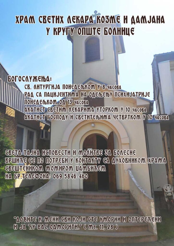 РАДИОНИЦЕ ПРАВОСЛАВНЕ ПСИХОТЕРАПИЈЕ, које води тим свештеника и катихета, одржавају се, понедељком од 13 часова, на одељењу психијатрије, при болничком Храму Светих бесребреника и лекара Козме и Дамјана, у кругу Опште болнице Сремска Митровица.