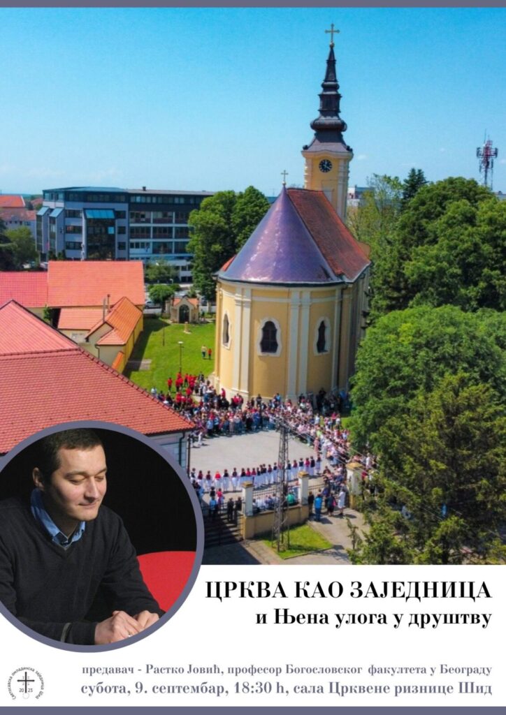 Предавање професора Растка Јовића Светосавска омладинска заједница Шид позива све заинтересоване на предавање професора Растка Јовића, у суботу у 18.30 часова. Теме: Која је улога Цркве у данашњем свету? На који начин доприноси заједништву? Некада је била центар просветног и административног система, а данас? Добро дошли у Црквену ризницу храма Преноса Моштију Светог Николе у Шиду.