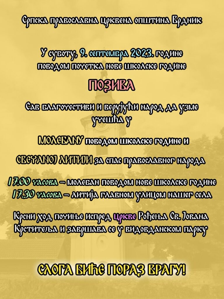 Српска православна црквена општина Врдник, позива сав благочестиви и верујући народ да учествује у молебану и свечаној литији, у суботу 9. септембра 2023. године.