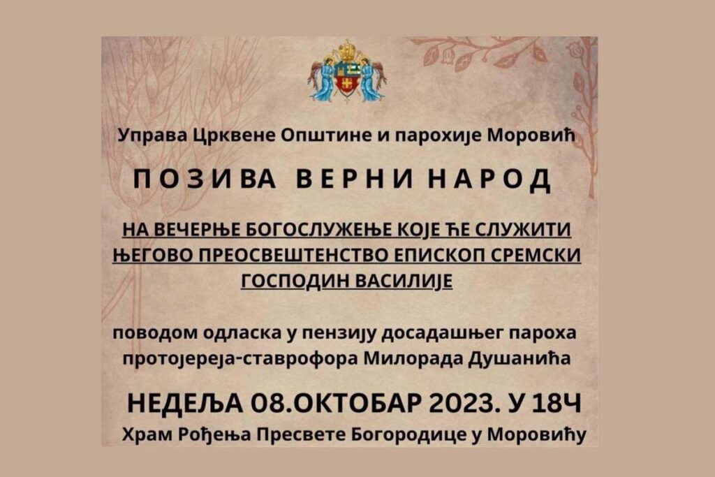 Управа Црквене Општине и парохије Моровић, позива верни народ на вечерње богослужење у недељу 08. октобра у 18 часова, које ће служити Његово Преосвештенство Епископ сремски Господин Василије, у храму Рођења Пресвете Богородице у Моровићу, а поводом одласка у пензију досадашњег пароха протојереја-ставрофора Милорада Душанића.