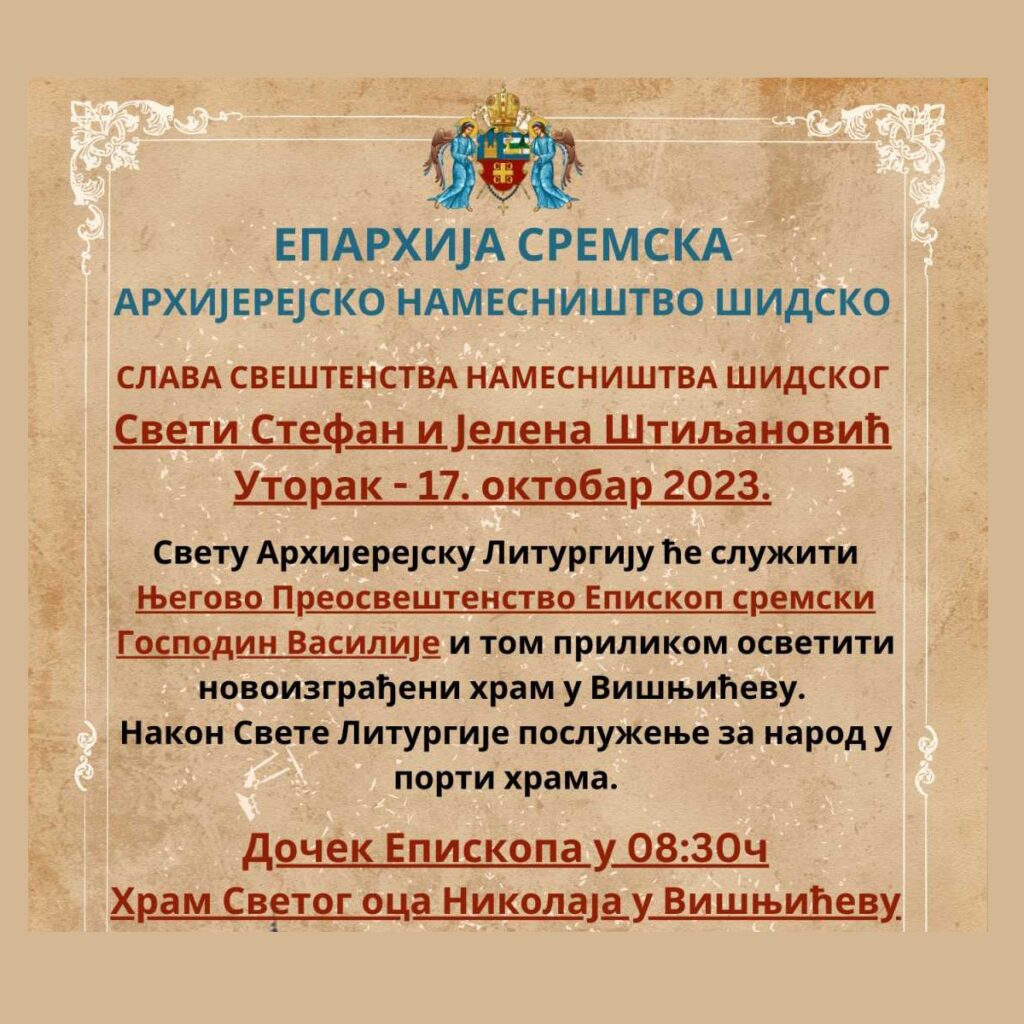 Позивамо сав верни народ да, у уторак 17. октобра 2023. године, узме молитвено учешће у Светој архијерејској Литургији, коју ће служити Његово Преосвештенство Епископ сремски Господин Василије, поводом празника Светих Стефана и Јелене Штиљановића, славе Архијерејског намесништва шидског. Прослава славе намесништва одржаће се у храму Преноса моштију Светог Оца Николаја у Вишњићеву. Дочек Његовог Преосвештенства је у 8:30 часова.
