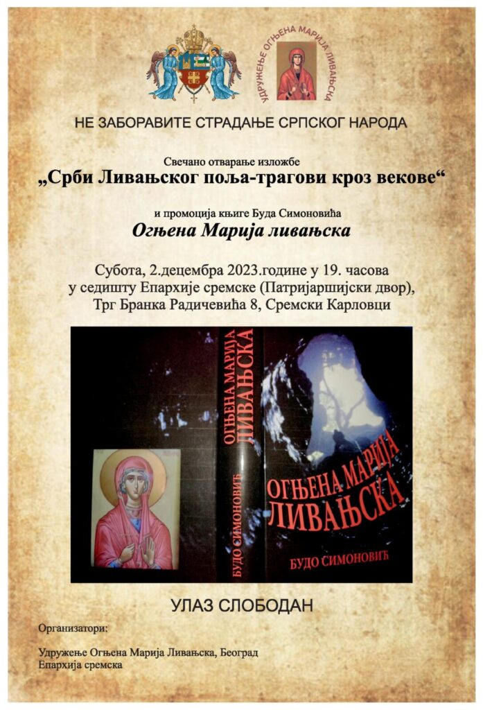 У организацији Епархије сремске и удружења “Огњена Марија ливањска”, у суботу 2. децембра 2023. године, у Патријаршијском двору у Сремским Карловцима, са почетком у 19 часова, одржаће се свечано отварање изложбе Срби Ливањског поља – трагови кроз векове и промоција књиге Огњена Марија ливањска.