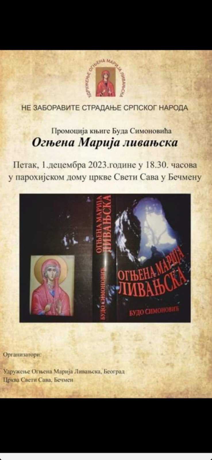 Петак, 01. децембар 2023. године, 18.30 часова, парохијски дом храма „Свети Сава“, Бечмен, промоција књиге Буда Симоновића „Огњена Марија Ливањска“.