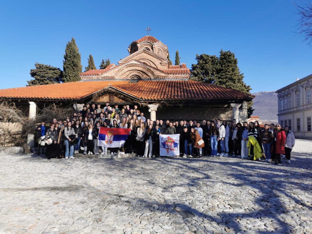 Поклоничко путовање по светињама Епархије врањске и Охрида Током сретењског распуста, од 15. до 18. фебруара 2024. године, за ученике Митровачке гимназије који похађају православну веронауку организовано је поклоничко и мисионарско путовање по светињама Врањске епархије и Охрида. Стодвадесет полазника веронауке, са својим вероучитељем ђаконом Стефаном Недићем и другим професорима, поклонили су се великим светињама Светог Прохора Пчињског, Светог Климента, Светог Наума, Пресвете Богородице Перивлепте, Светог Јована Канео, Бигорског манастира, Рајчице и најзначајнијих знаменитости града Скопља. Изузетно је важно да су средњошколци одлучили да слободне дане, око државног празника Сретења Господњег, проведу у православним светињама и на Охридском језеру, где су били смештени. Путовање је организовано са благословом духовног оца Епархије сремске, Његовог Преосвештенства Епископа сремског Господина Василија.