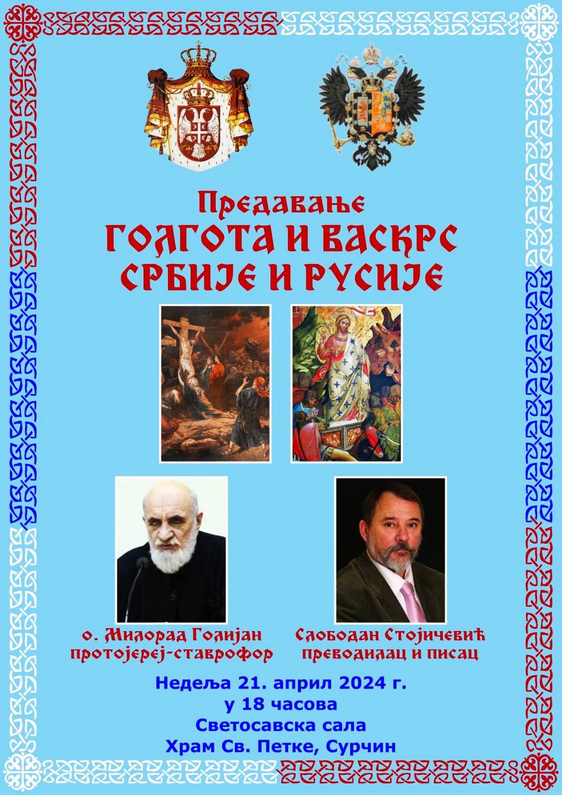 Предавање “Голгота и Васкрс Србије и Русије”, биће одржано у недељу, 21. априла 2024. године, са почетком у 18 часова, у Светосавској сали, храма Свете Петке у Сурчину.