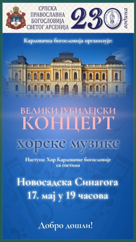 Српска православна богословија Светог Арсенија из Сремских Карловаца организује, велики концерт хорске музике, поводом јубилеја – 230 година од оснивања. Концерт ће извести хор Карловачке богословије са гостима у новосадској Синагоги, у петак, 17. маја, у 19 часова.