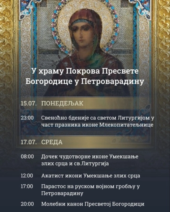 Управа храма Покрова Пресвете Богородице у Петроварадину позива сав верни народ да се придружи молитвеном сабрању 15. и 17. јула 2024. године.