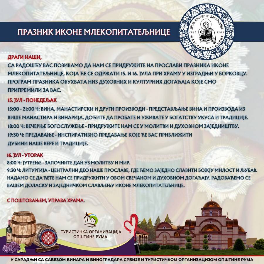 Драги наши, у сарадњи са Савезом виноградара и винара Србије, као и Туристичком организацијом Општине Рума, са радошћу вас позивамо да нам се придружите на прослави празника иконе Млекопитатељнице, која ће се одржати 15. и 16. јула при храму у изградњи на Борковцу