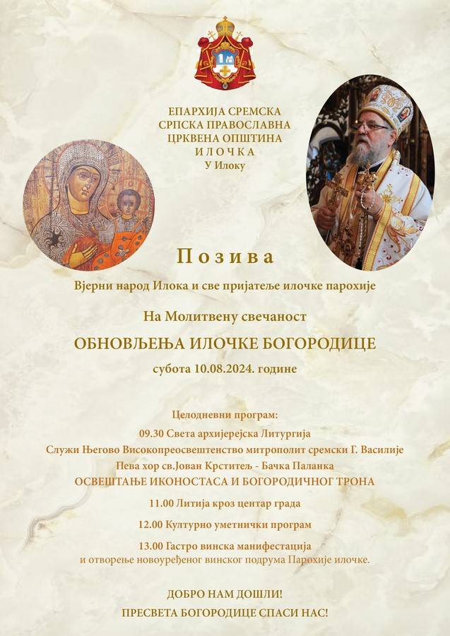 Епархија сремска и Српска православна црквена општина илочка позивају верни народ Илока и све пријатеље илочке парохије на Молитвену свечаност обновљења илочке Богородице у суботу 10. августа 2024. године.