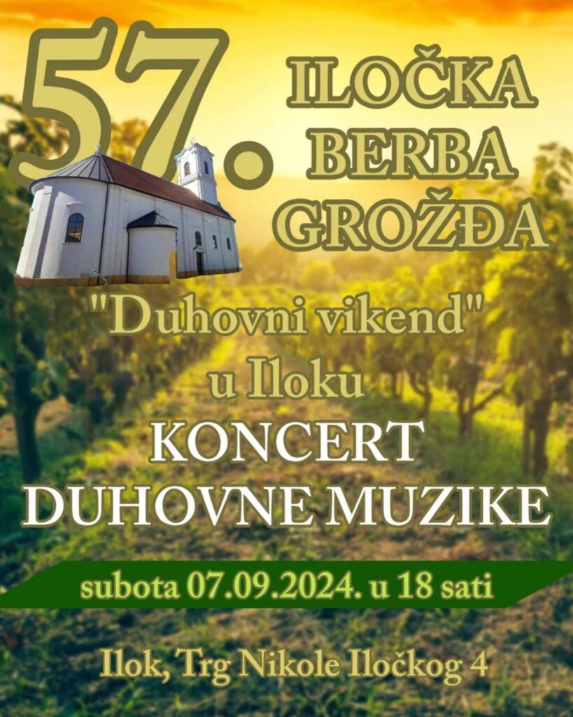 „Духовни викенд у Илоку“ , концерт духовне музике, одржаће се 07. септембра у 18 часова у оквиру традиционалне 57. по реду манифестације – Илочка берба грожђа, на Тргу Николе Илочког бр. 4.