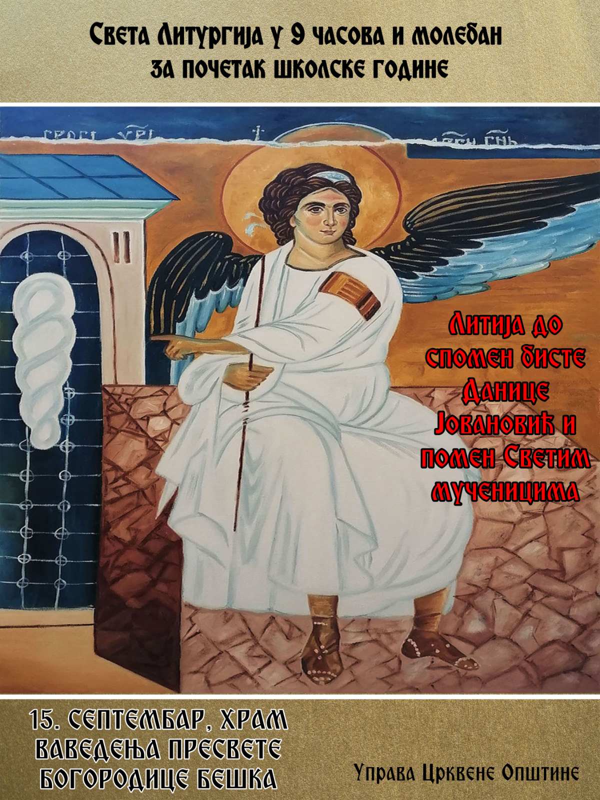 Управа храма Ваведења Пресвете Богородице позива верни народ и децу да, 15. септембра 2024. године, присуствују Светој Литургији и призиву Светог Духа за почетак школске године. После Литургије организоваћемо свечану литију до Трга Српских мученика и обавити помен Бешчанским мученицима, стрељаним у Првом светском рату: протојереју Светозару Дејановићу, Даници Јовановић, Владимиру Марковићу, Светозару Бојићу, Владимиру Рацу и Милану Варићаку.