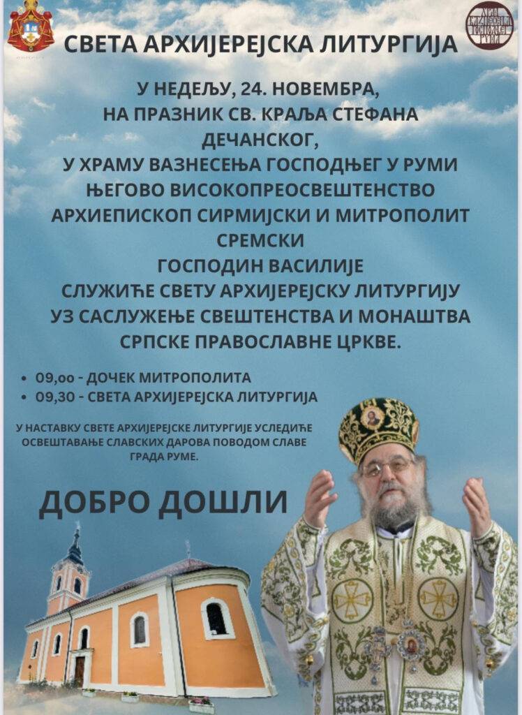 Света архијерејска Литургија у храму Вазнесења Господњег у Руми, одржаће се у недељу, 24. новембра, са почетком у 9.30 часова.
