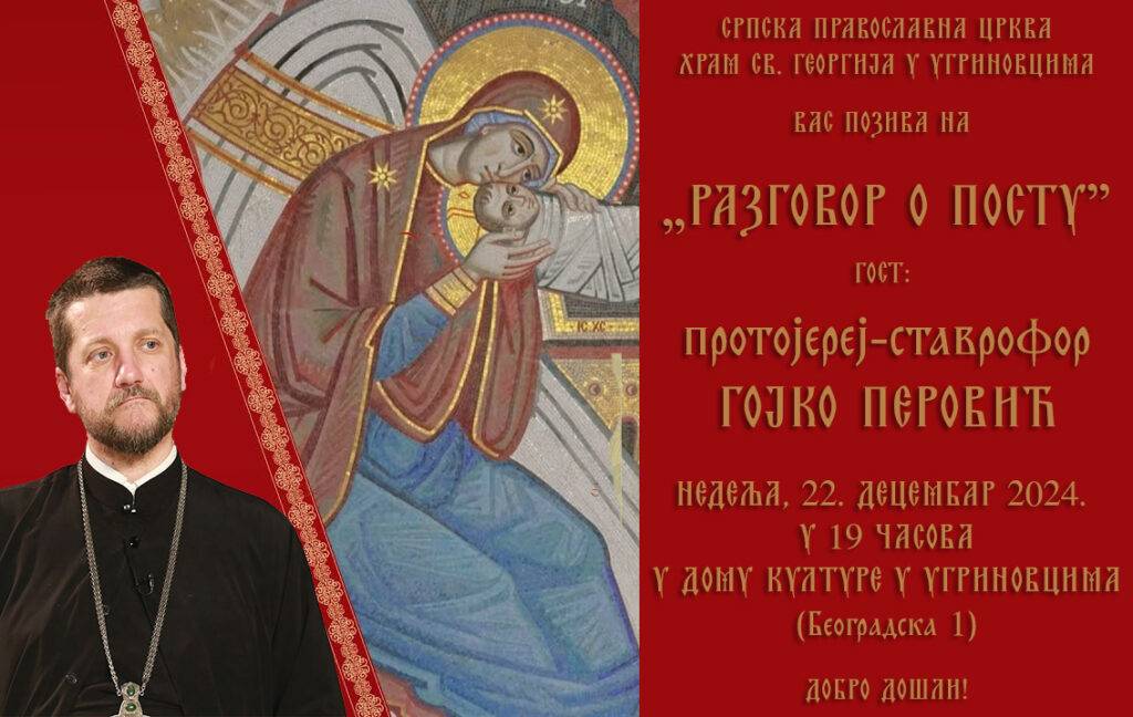 Духовно вече у Угриновцима Храм Светог Георгија у Угриновцима позива сав верни народ да узму учешће на духовној вечери под темом “Разговор о посту”, о којој ће беседити протојереј-ставрофор Гојко Перовић. Придружите нам се у недељу, 22. децембра, са почетком у 19 часова, у Дому културе у Угриновцима.