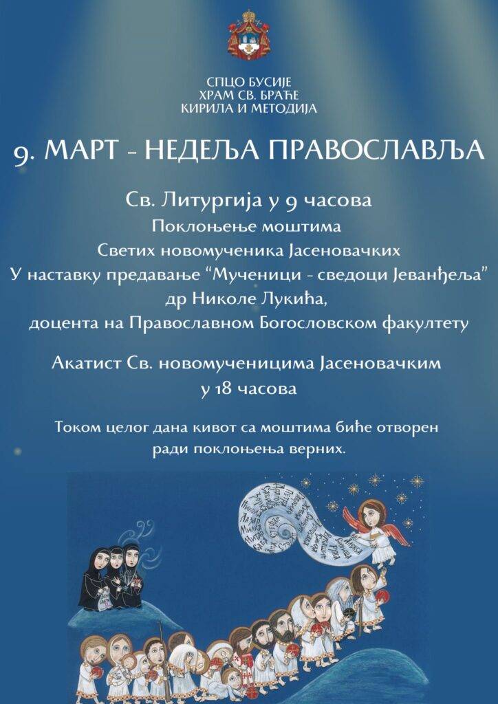 Поклоњење моштима Светим новомученицима јасеновачким у Бусијама. Света Литургија у 9 часова, у наставку предавање под темом: “Мученици – сведоци Јеванђеља”, др Николе Лукића, у 18 часова акатист Светим новомученицима јасеновачким.