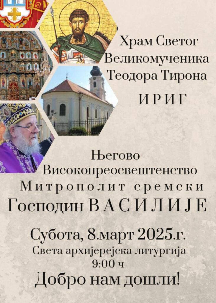 Управа храма Светог великомученика Теодора Тирона у Иригу позива сав верни народ на Свету архијерејску Литургију, коју ће служити Његово Високопреосвештенство Митрополит сремски Господин Василије, у суботу 8. марта, са почетком у 9 часова.