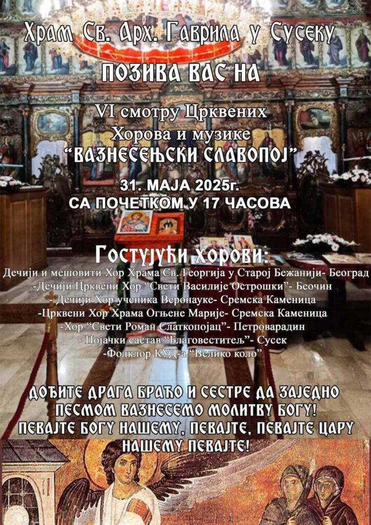 Управа храма Светог архангела Гаврила у Сусеку позива сав верни народ на шесту по реду смотру црквених хорова и музике „Вазнесењски славопој“, 31. маја, са почетком у 17 часова.