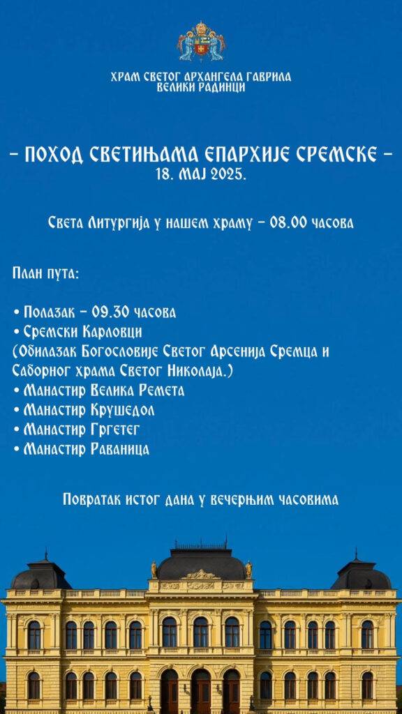 НАЈАВА ДУХОВНЕ ЕКСКУРЗИЈЕ ПОД НАЗИВОМ „ПОХОД СВЕТИЊАМА ЕПАРХИЈЕ СРЕМСКЕ” ЗА ДЕЦУ ВЕЛИКИХ РАДИНАЦА КОЈА ПОХАЂАЈУ ВЕРСКУ НАСТАВУ