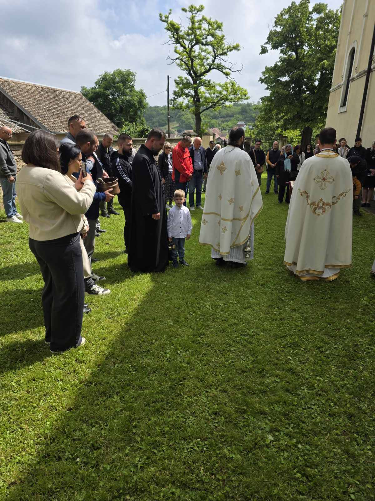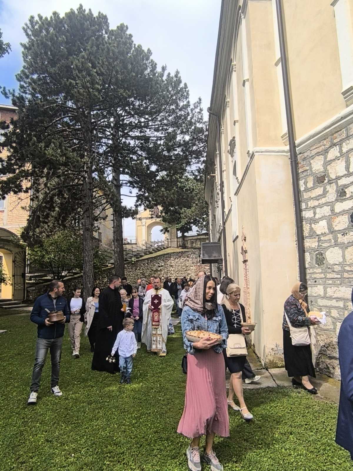 Након Свете тајне Причешћа кренуло се у литију око храма, а затим је освештан славски колач и кољиво које су ове године припремили кумови, породица Ристановић из Ирига и кума Веселка из Новог Сада. Они су четвртину колача предали представницима општине Ириг који су преузели кумство за наредну годину.