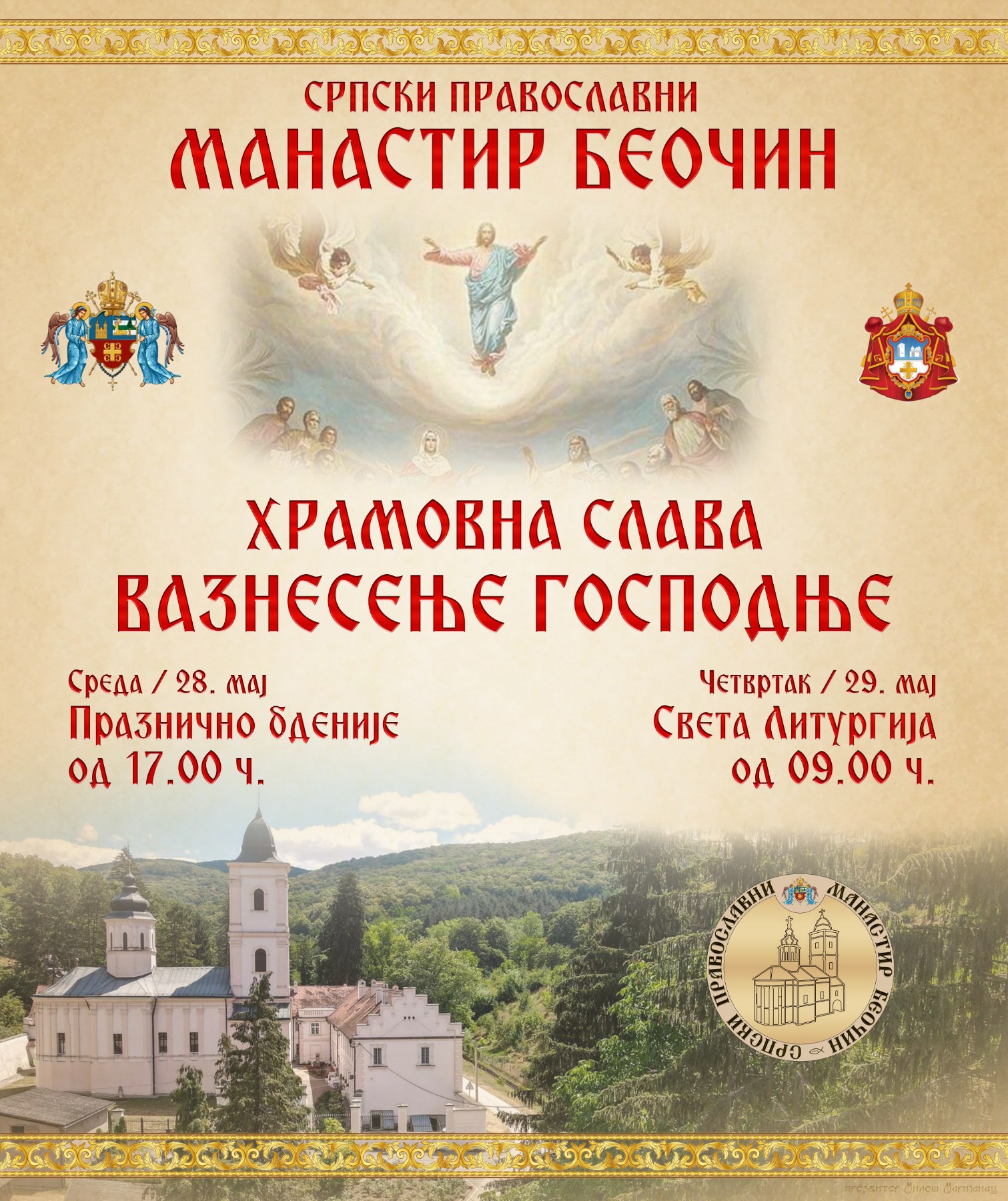 Управа манастира Беочина позива сав верни народ на обележавање храмовне славе, Вазнесења Господњег, 28. и 29. маја.