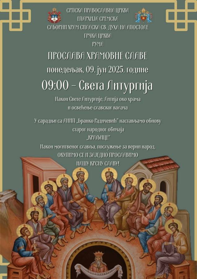 Саборни храм Силаска Светог Духа на апостоле у Руми, позива сав верни народ на обележавање храмовне славе, у понедељак, 9. јуна 2025. године, са почетком у 9 часова.