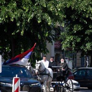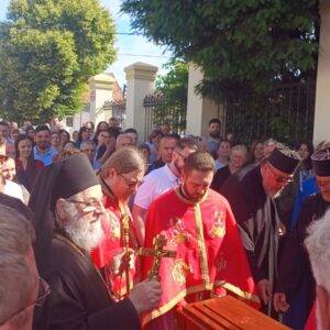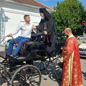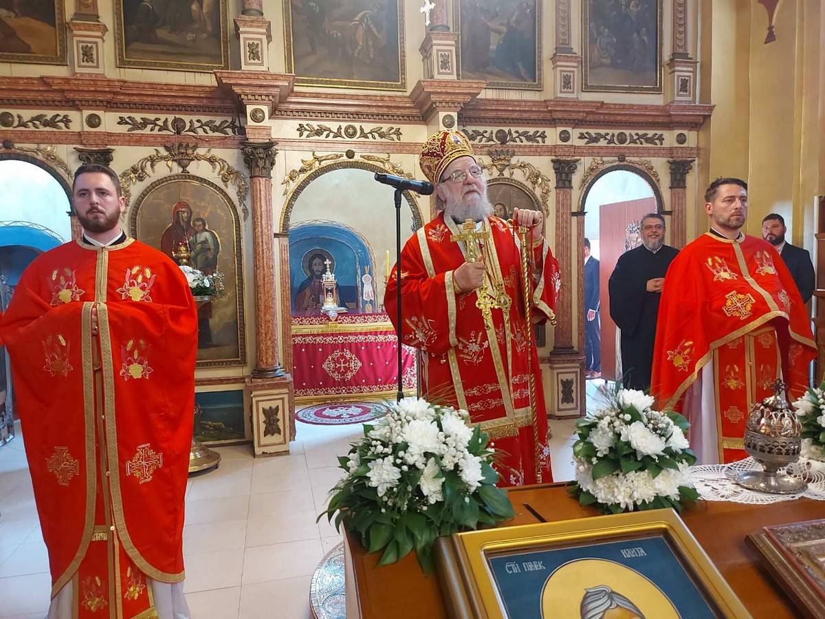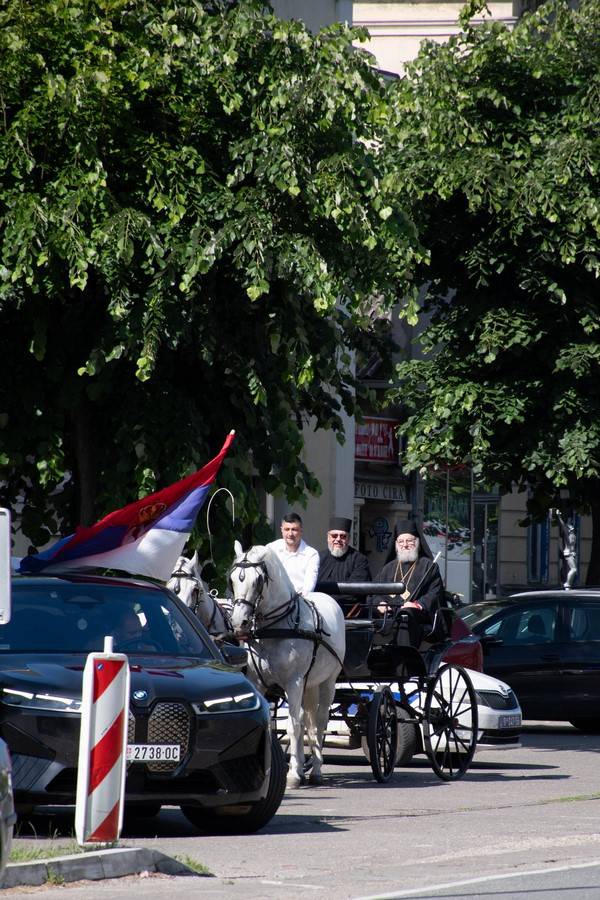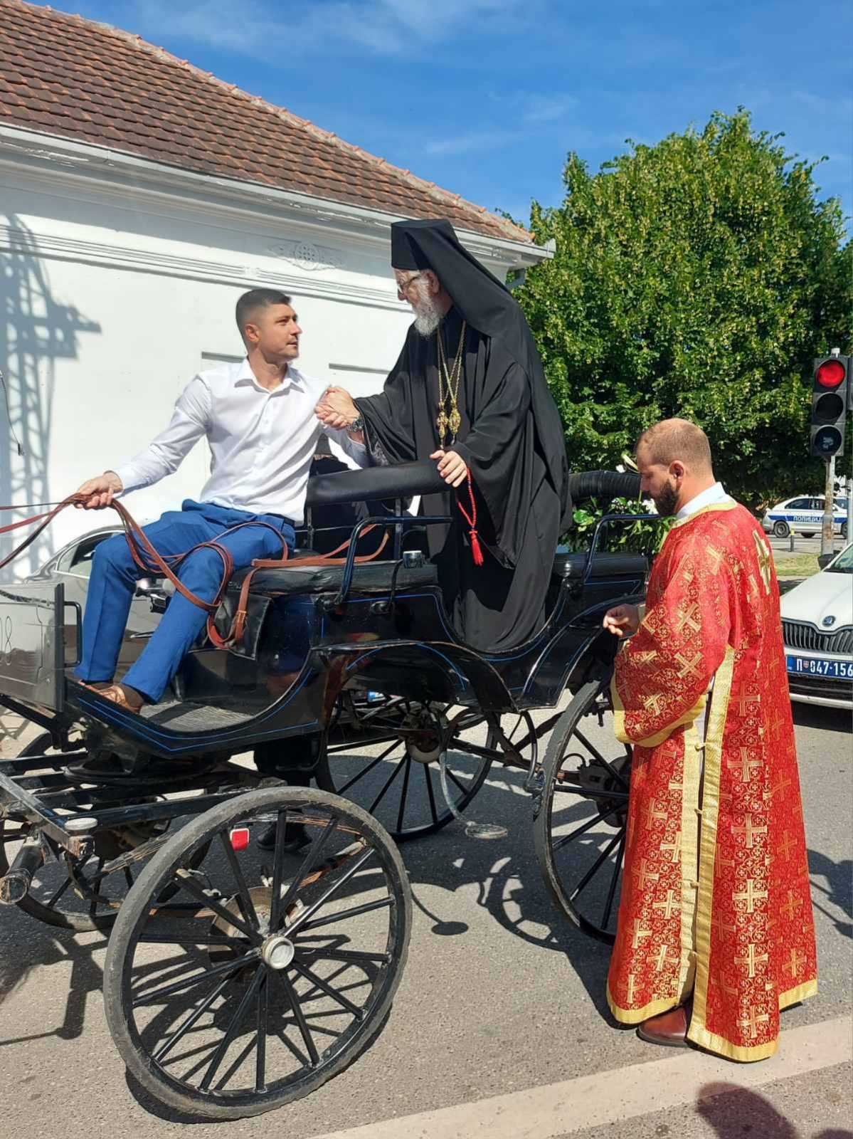 Митрополит је стигао свечано – фијакером до храма, где су га дочекали верни народ и Свете мошти новомученика јасеновачких, којима се Високопреосвећени са побожношћу поклонио.