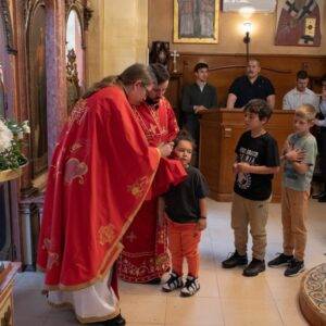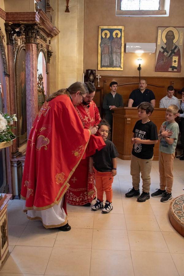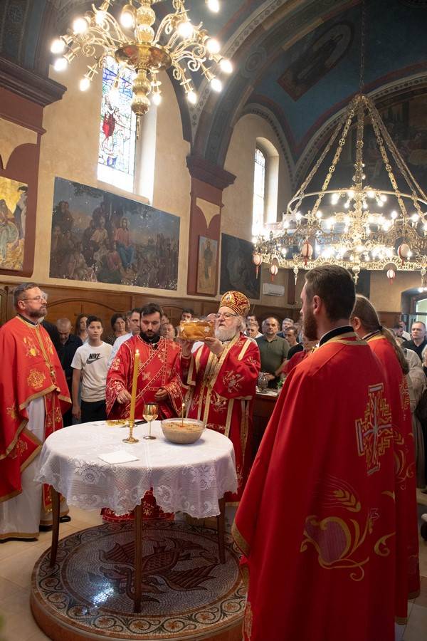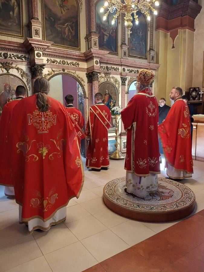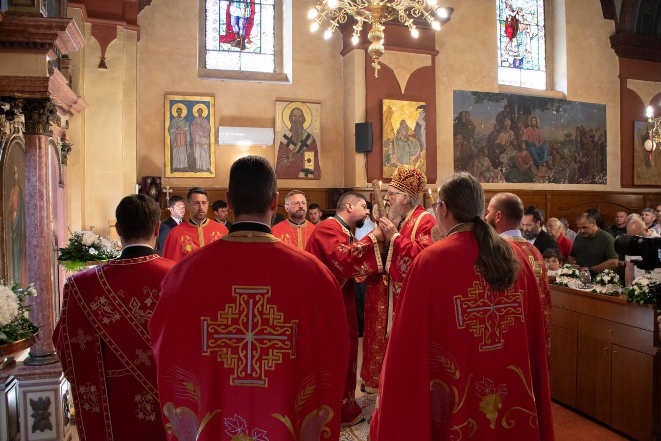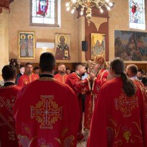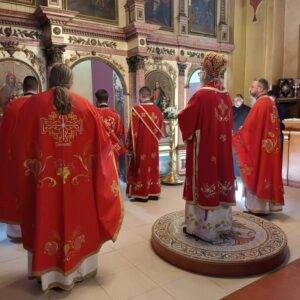 На Светој архијерејској Литургији Његовoм Високопреосвештенству Митрополиту сремском Господину Василију саслуживали су протојереј-ставрофор Дарко Ђого, редовни професор Православног богословског факултета Светог Василија Острошког у Источном Сарајеву и изасланик Светог Архијерејског Синода, протојереј-ставрофор Јован Милановић, ректор Богословије Светог Арсенија у Сремским Карловцима, јереј Саша Милијашевић из храма Покрова Пресвете Богородице у Старој Пазови, јереј Стефан Гавровски из храма Свете браће Кирила и Методија у Бусијама, епархијски протођакон Горан Власац и ђакон Стефан Станојевић.