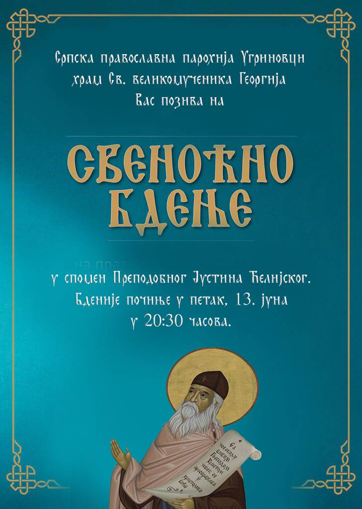 Управа храма Светог великомученика Георгија у Угриновцима позива сав верни народ на свеноћно бдење у спомен Преподобног Јустина Ћелијског, у петак, 13. јуна, у 20.30 часова.