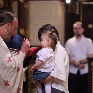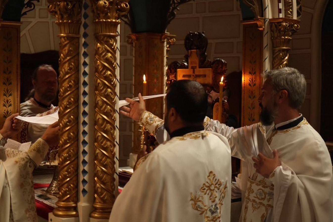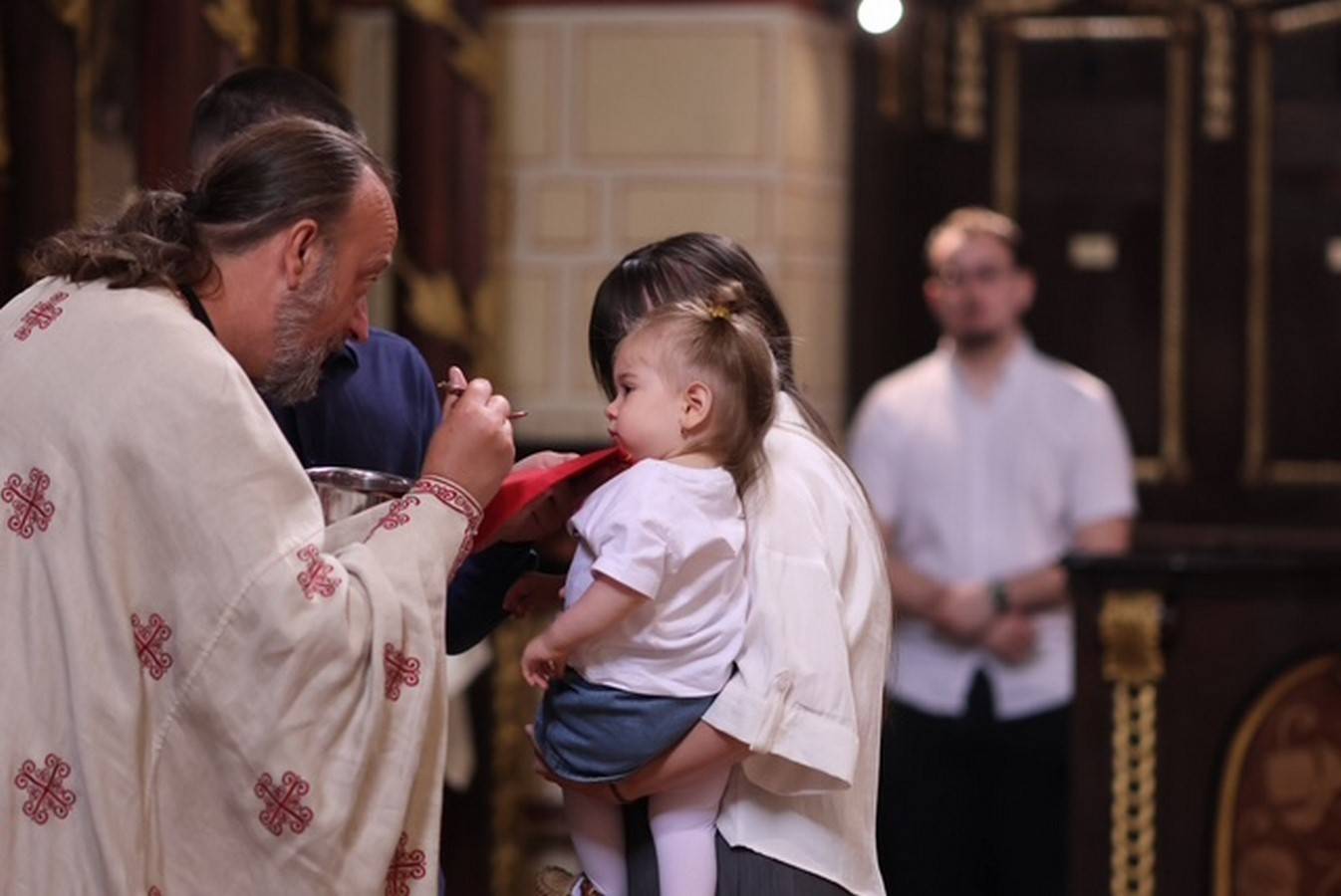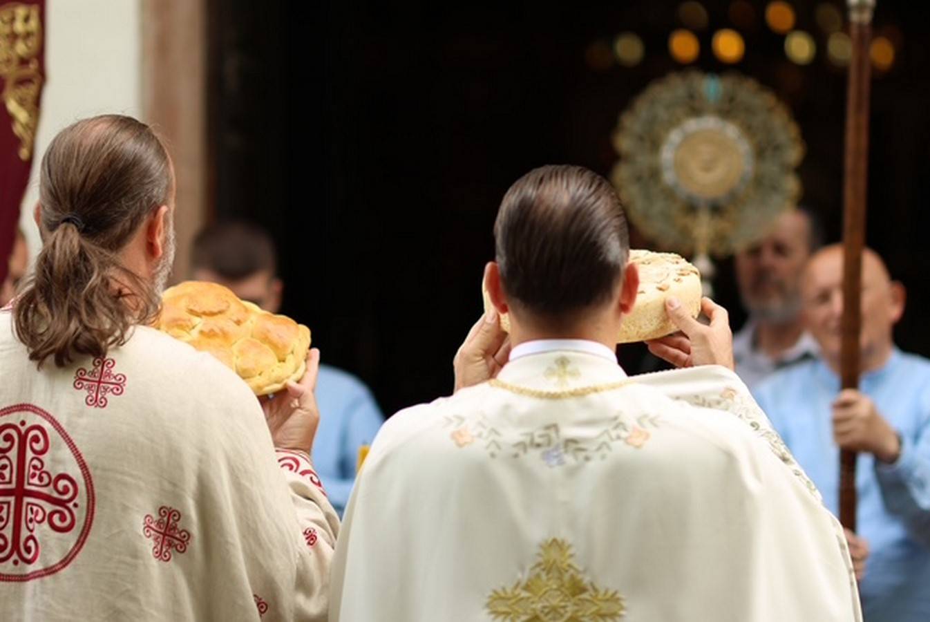 Светим тајнама Тела и Крви Христове приступио је већи број сабраних, а након Светог причешћа у славску литију, са трократним опходом око храма, кренуло је свештенство са верним народом, да би се свеосвећујућа благодат Пресветога Духа, која је сишла на евхаристијске Дарове и народ Божји у храму, на тај начин проширила и на све оно што храм окружује и све оне који на том простору живе.