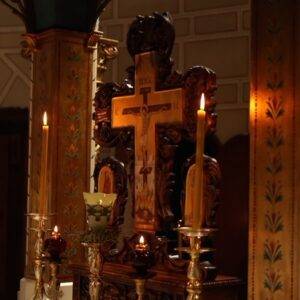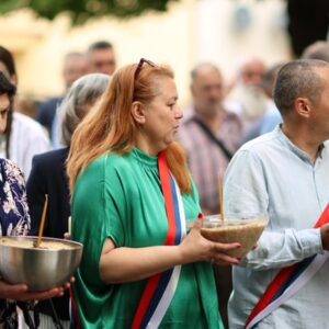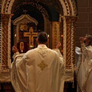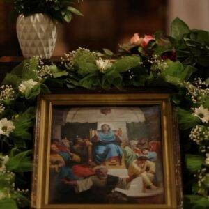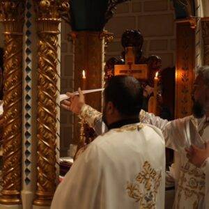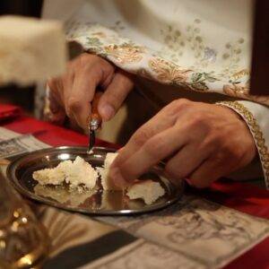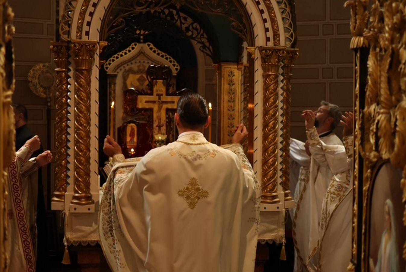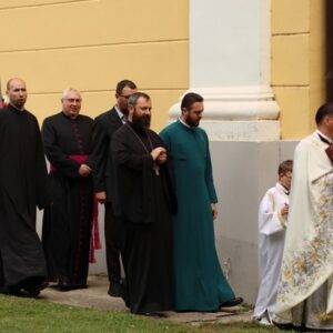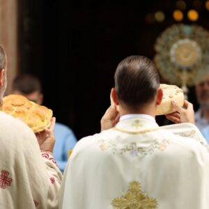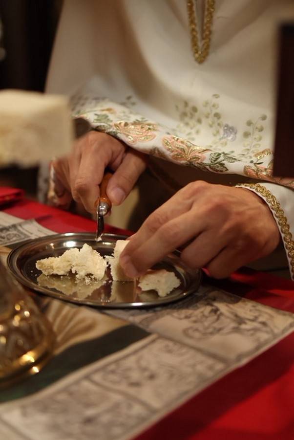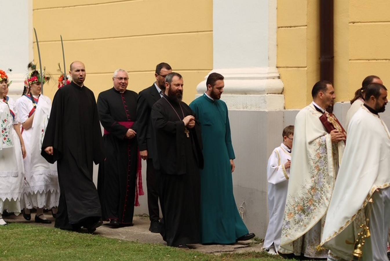 Светим тајнама Тела и Крви Христове приступио је већи број сабраних, а након Светог причешћа у славску литију, са трократним опходом око храма, кренуло је свештенство са верним народом, да би се свеосвећујућа благодат Пресветога Духа, која је сишла на евхаристијске Дарове и народ Божји у храму, на тај начин проширила и на све оно што храм окружује и све оне који на том простору живе.