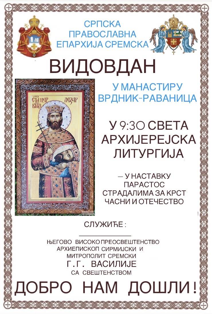 Управа манастира Раваница у Врднику, позива верни народ на Свету архијерејску Литургију, на Видовдан, 28. јуна, са почетком у 9.30 часова.