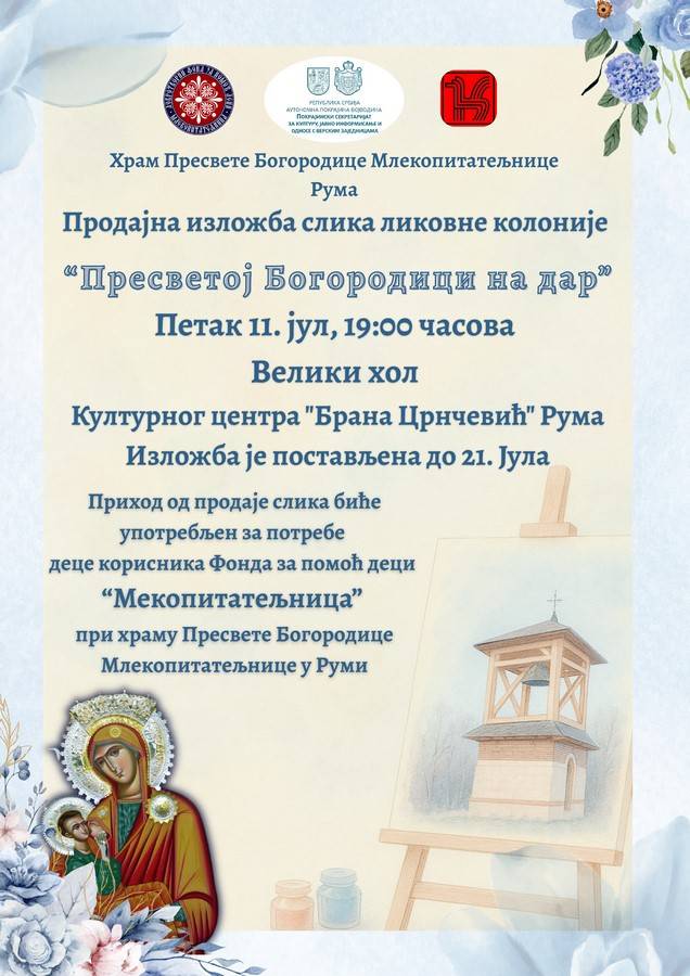 Управа храма Пресвете Богородице Млекопитатељнице у Руми, позива сав верни народ на изложбу слика, са одржане ликовне колоније под називом „Пресветој Богородици на дар”, која ће бити отворена за јавност од 11 – 21. јула. Уметничка дела ће свечано бити представљена публици у петак, 11. јула, са почетком у 19 часова, у Културном центру у Руми, који је заједно са Покрајинским секретаријатом за културу, јавно информисање и односе с верским заједницама покровитељ овог догађаја. Изложба је продајног карактера, а приход који буде остварен биће на располагању корисницима Фонда за помоћ деци „Млекопитатељница”. Прослава празника Пресвете Богородице Млекопитатељнице биће одржана 15. и 16. јула у Борковцу. Свету архијерејску Литургију, у среду, 16. јула са почетком у 9 часова, служиће Високопреосвећени Митрополит Василије, а своје присуство потврдили су представници Владе Републике Србије, Покрајинске владе и Општине Рума.