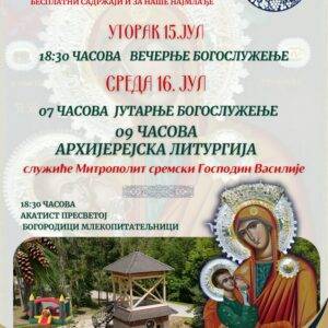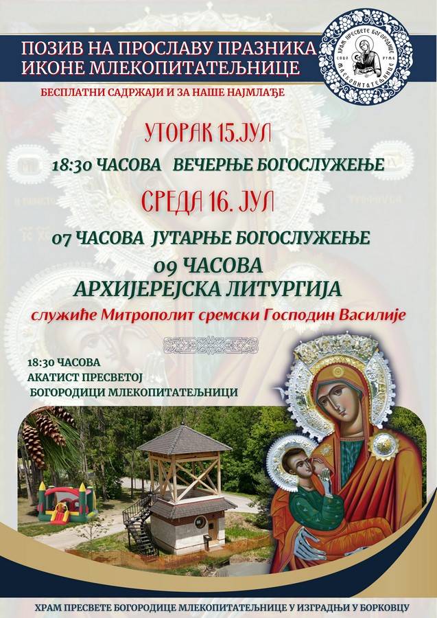 Прослава празника Пресвете Богородице Млекопитатељнице биће одржана 15. и 16. јула у Борковцу. Свету архијерејску Литургију, у среду, 16. јула са почетком у 9 часова, служиће Високопреосвећени Митрополит Василије, а своје присуство потврдили су представници Владе Републике Србије, Покрајинске владе и Општине Рума.