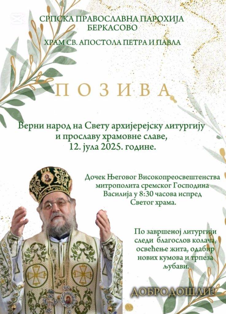Српска православна парохија Беркасово и управа храма Светих апостола Петра и Павла, позивају верни народ на Свету архијерејску Литургију и прославу храмовне славе, 12. јула 2025. године.