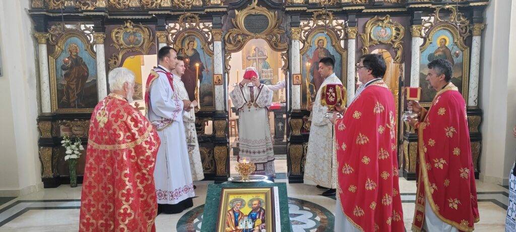 СВЕТА АРХИЈЕРЕЈСКА ЛИТУРГИЈА У БЕРКАСОВУ На празник Светих апостола Петра и Павла, у суботу 12. јула 2025. године, Његово Високопреосвештенство Aрхиепископ сирмијски и Митрополит сремски Господин Василије служио је Свету архијерејску Литургију у храму у Беркасову, који првоврховне апостоле прославља као своје небеске заступнике. Високопреосвећеном Митрополиту у узношењу бескрвне жртве саслуживали су: протојереј-ставрофор Радомир С. Мишић, архијерејски намесник шидски, протојереј-ставрофор Ђорђе Воларевић, умировљени архијерејски намесник шидски, протојереј-ставрофор Предраг Азап, парох илочки, епархијски протођакон Горан Власац и шидски ђакон Александар Јефтенић. За певницу је био задужен надлежни парох беркасовачки, протојереј Бојан Цветковић, коме су помагали студенти теологије из шидског намесништва и појци из Шида. Светој Архијерејској Литургији, поред бројног верног народа, присуствовао је и председник Општине Шид, господин Зоран Семеновић са својим сарадницима. По заамвоној молитви, обављен је чин освећења славских дарова, које су принели овогодишњи кумови славе. Након завршетка Литургије, пригодну беседу одржао је Високопреосвећени поучивши верни народ о данашњем празнику, као и о значају које апостоли Петар и Павле имају за васцели хришћански свет. За служашче свештенство и верни народ приређена је трпеза љубави у парохијском дому, коју су заједничким трудом припремили кумови славе и домаћин сабрања, отац Бојан. Текст: Ненад Србљанин Фотографије: Марко Јефтенић Exif_JPEG_420 Exif_JPEG_420